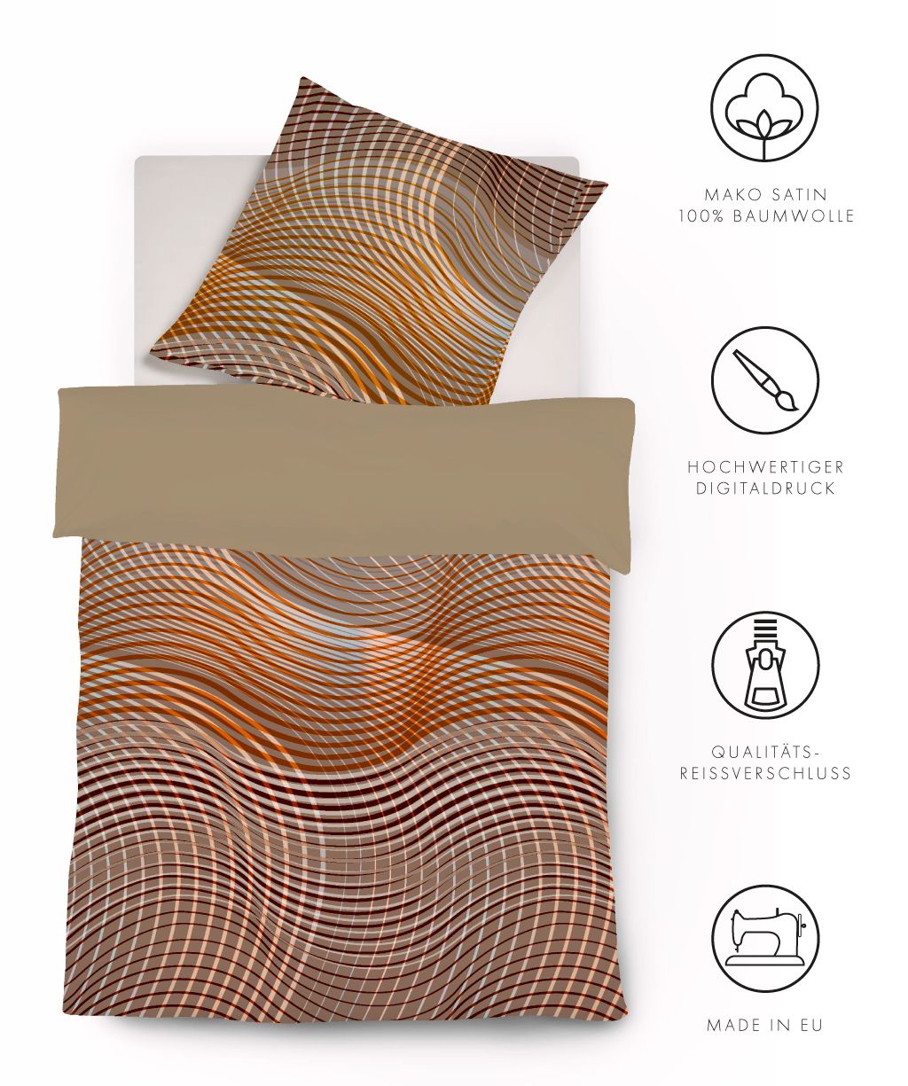 Dvipusė mako satino patalynė su aukštos kokybės skaitmeniniu spaudiniu, pagaminta iš 100 % medvilnės, garantuoja stilingą miego komfortą. Satininis patalynės audinys pasižymi rafinuotu blizgesiu ir lygiu paviršiumi. Tai užtikrina ypač malonų pojūtį odai. Be to, medžiaga reguliuoja drėgmę, yra patvari ir lengvai prižiūrima – ideali patalynės kokybė ištisus metus.