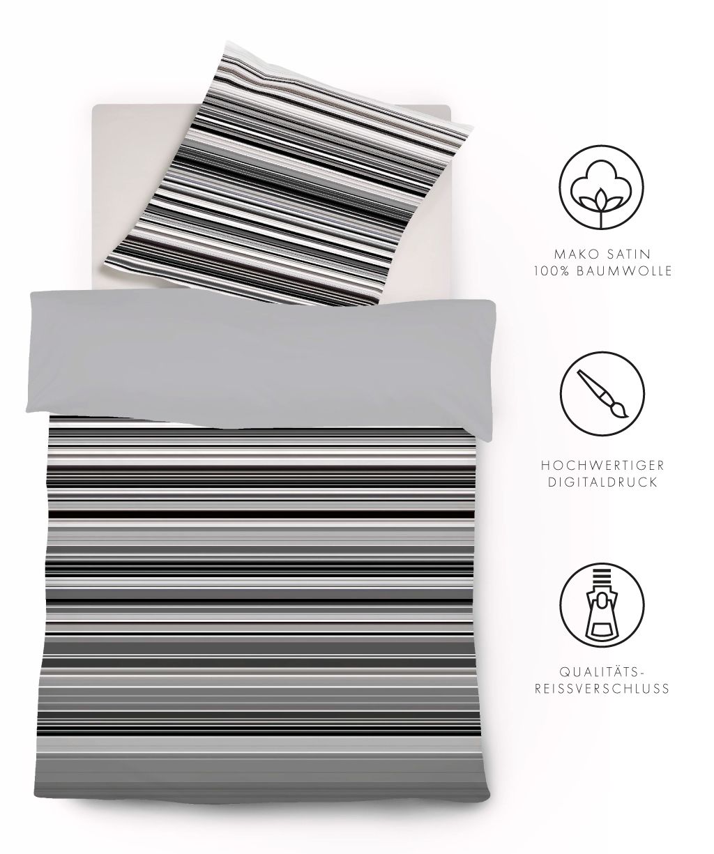 Aukštos kokybės skaitmeniniu būdu atspausdinta satino patalynė, pagaminta iš 100 % medvilnės, garantuoja stilingą miego komfortą. Satininis patalynės audinys pasižymi rafinuotu blizgesiu ir lygiu paviršiumi. Tai užtikrina ypač malonų pojūtį odai. Be to, medžiaga reguliuoja drėgmę, yra patvari ir lengvai prižiūrima – Mako satinas yra ideali patalynė ištisus metus.