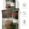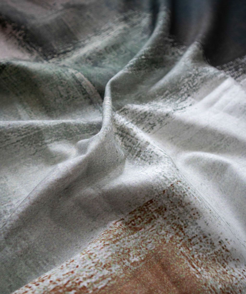 Abstraktus languotas raštas tamsiai žalių ir raudonų atspalvių paletėje persipina su baltos ir smėlio spalvos akcentais. Šis spalvų derinys suteikia dizainui šiltą, žemišką atmosferą, kuri yra ir raminanti, ir estetiškai patraukli. Laipsniško spalvų intensyvumo naudojimas ir susiliejantys perėjimai sukuria dinamišką, tačiau harmoningą vaizdą, idealiai tinkantį moderniam miegamajam.