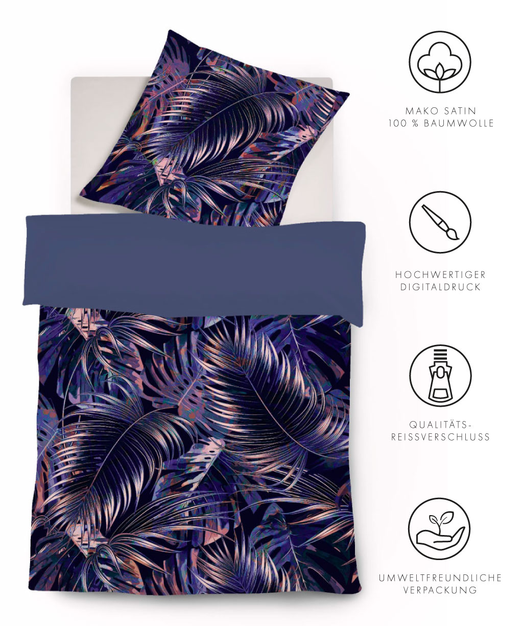 Daili mako satino patalynė su aukštos kokybės skaitmenine spauda ir lygia apverčiama puse, mėlynos spalvos, pagaminta iš 100% merserizuotos medvilnės, su užtrauktuku.