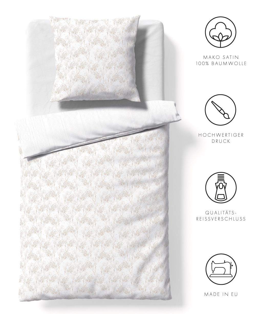 MODERN GARDEN – puiki Mako satino patalynė, pagaminta iš 100 % ilgapluoštės, mercerizuotos ir itin šukuotos medvilnės, su aukštos kokybės spauda ir elegantišku žolės motyvu. Įkvėpkite šio subtilaus dizaino, kuriame baltame fone pavaizduotos smulkios, subtilių smėlio atspalvių žolės. Dvipusė pusė su subtiliu dryžuotu raštu stilingai ir nesenstančiai papildo dizainą.
